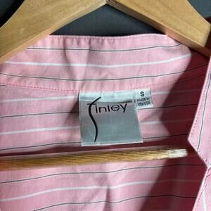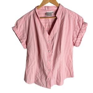 Finley Diamond Short Sleeve Button-Down Poplin Shirt in Striped Pink. Size S / Small. Features V-neck, cuffed short sleeves, button front, and stripe print. Excellent condition, no flaws.