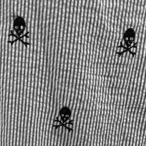 Skull & Crossbones Pirate Theme Embroidered Seersucker Wrap Dress from Finley in Gray & White Stripes. Size 4