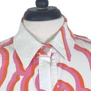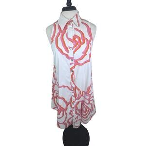 Finley shirtdress in macro Pink and Orange floral-print poplin. Features buttons running down the front and back, Collared neckline Button closures, Sleeveless, Side seam pockets, Swing silhouette, Shirttail hem hits around the knee. Cotton Machine wash Made in USA of Imported Fabric MSRP: $260