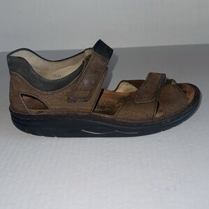 Finn Comfort brown and black leather Samara sandals. Handmade in Germany. Ergonomically designed footbed. Removable insole. Very small scrape on left front shoe as seen in photo. Size 43 = US 10. Good pre owned condition