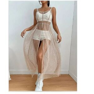 Fiomva Women Sequin Split Mesh Beach Cover Up Midi Dress Spaghetti Strap NWOT