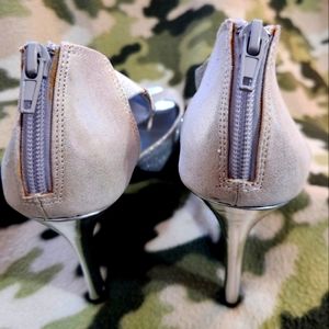 Hey what's up yall here's details of a nice pair of heels in silver glittery type pattern. Glittery as in the ascetic of being shiny with a defined pattern. Practically brand new as they've been tried and not worn outdoors - - Have they been tossed aound in the closet and thrown in totes resulting in some scuffs here and there-?