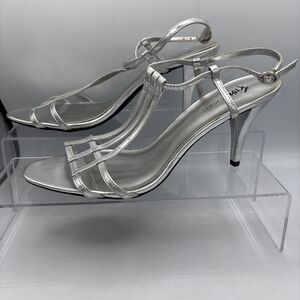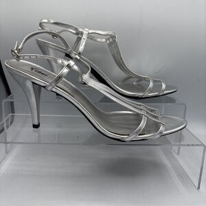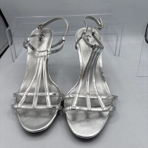 Fioni Night Size 11 Silver T Strap Open Toe stiletto Heels Formal wedding
