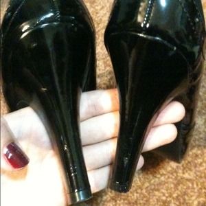 Black Oxford heels with a sort of faux suede on the top of the heel. There are a couple scratches but nothing noticeable. They're very comfortable but a little too big on me.