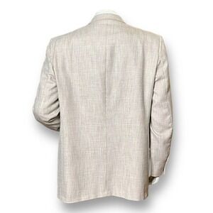 The sport coat is in good used condition. There is one remnant of an ink stain on the interior of the jacket, near the button holes, and one very small snag on the bottom of the left side. Also, given this is custom, there are no materials or size tags. The sport coat feels like wool, but this can’t be verified.