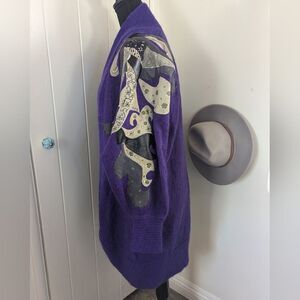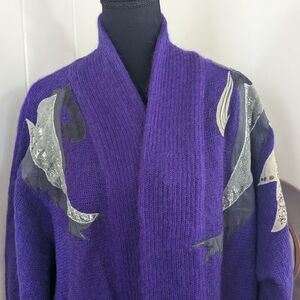 Description: Vintage Fiorelle Kid Mohair Purple Cardigan Lagenlook Whimsigoth Fairy Grunge Art to Wear, gorgeous applique detail on the shoulders and back - made of faux leather, soft knit fabric with a cocoon like, cozy silhouette, made in Turkey