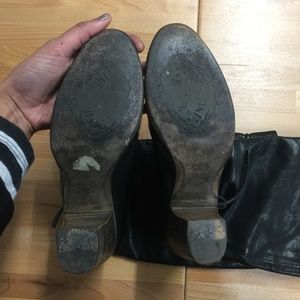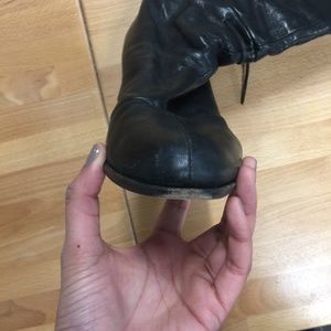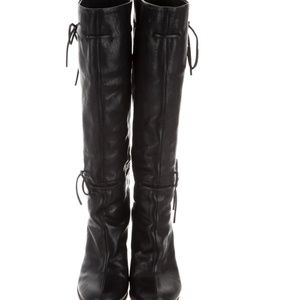 Black leather Fiorentini + Baker pointed toe boots with tonal stitching throughout, stacked heels and tie closures at uppers. PLEASE NOTE: The front of the sole is detaching a bit on both shoes (pictured), but this could be fixed (glued back together) at a shoe repair location.