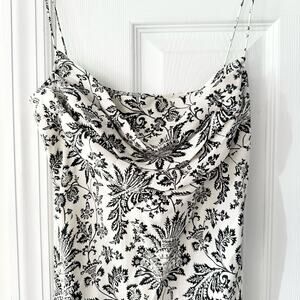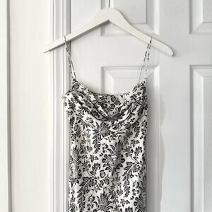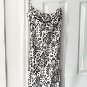 Size 8 from Fiori di Zucca. 100% silk. Vintage Y2K. Black and white french countryside floral print midi column dress. Drape front neckline. Side zip closure. Body hugging. Preowned in good condition with no stains or tears.