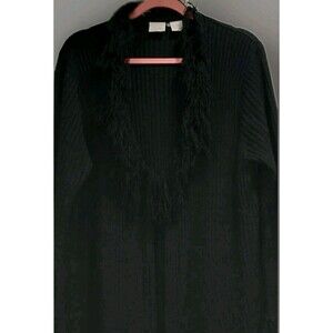 Channel your inner dark-romantic with this vintage Fiorlini International long cardigan duster. Features a dramatic ribbed knit texture, fringe trim at the collar, cuffs, and hem, and a single-clip closure at the chest (second clasp missing but top one works perfectly). Stretchy, cozy, and dripping with witchy / grunge / Y2K vibes the kind of piece that turns heads at festivals or layered over lace and boots.