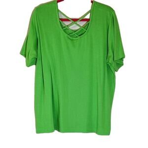 Fiorlini International Plus siz bright green short sleeve scoop neck sweater with criss cross feature in the back. Very cute sweater. I love this color paired with white and black. Classic.