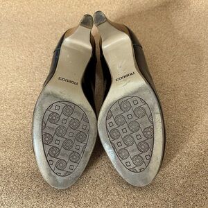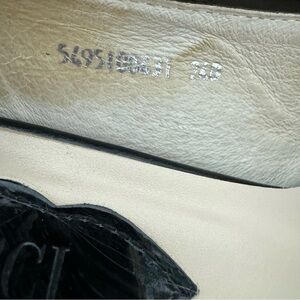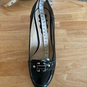 Classy black patent leather heels with wood heel. Features a sleek design with a stylish silver hardware. Perfect for the office! No size in shoe but fits as a 7.5