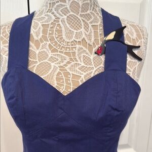 Chic navy mini dress with a fitted bodice. Features wide straps and a flared skirt. Perfect for stylish outings.