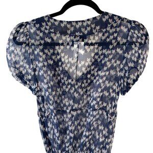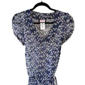 This Fiorucci dress features a lightweight sheer fabric with a playful blue and white print, puff sleeves, and a tiered hemline. Designed for a breezy and stylish look, it offers an adjustable waist tie for a customizable fit. Made in Italy.