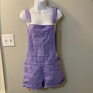 Stylish purple short overalls with adjustable straps and front pocket. Perfect for casual outings.