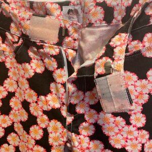 Fabric is a soft stretch twill in 98% cotton 2% elastane, in a floral print of white and neon pink and yellow on black