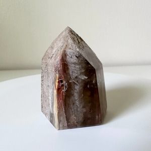 Stunning red Amphibole Quartz crystal point/tower. This piece has fibrous gray inclusions, some clarity, and a tiny rainbow when the light hits.