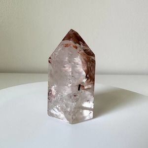Stunning red Amphibole Quartz point/tower with clarity and fibrous peachy pink, red, and white inclusions.