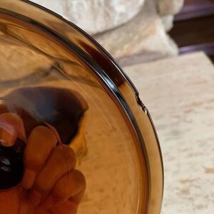 ****There is a chip on the side of the lid(pictured). There is some normal signs of wear on dish. Inside basket has some wear where the smaller woven pieces have come apart but the bigger weave that holds it together is still intact (pictured.