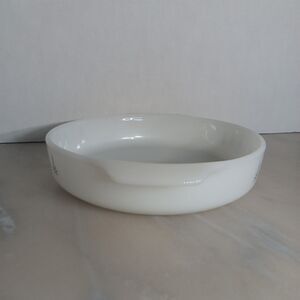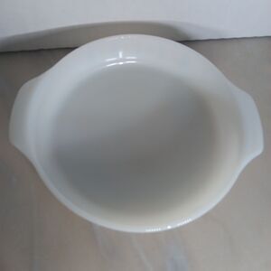 This vintage Fire-King Anchor Hocking casserole dish is a beautiful addition to any kitchen. Made in the United States in 1973, it features a glossy finish on its round milk glass body. The dish has a single compartment and measures 9 inches in width, depth, and length with a height of 2 inches. It is machine washable for easy cleaning and has a handle for easy transport. This mid-century modern style casserole dish is perfect for serving and keeping food warm or cold for various periods.