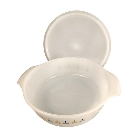 This vintage Pyrex casserole dish features a classic white design with subtle patterns, embodying both elegance and functionality. It's oven-safe, making it suitable for meal preparation and serving. The durable construction ensures longevity, while its 1.5-quart capacity is ideal for various dishes. With a matching lid, it adds style to any kitchen setting.