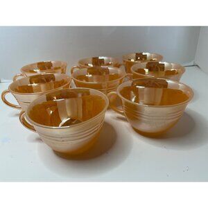 Vintage Fire King Peach Luster set includes 8 cups, 2 saucers, and a creamer. Perfect for collectors or tea enthusiasts. The lustrous finish adds elegance and charm to your table setting.