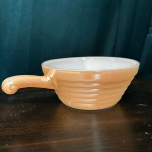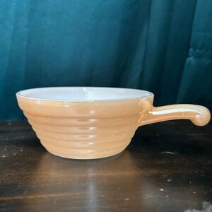 Vintage milk glass with peach luster handled soup bowl and beehive ribbed exterior
