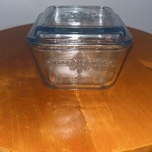 The item is a vintage Fire-King Very Light Blue Casserole/Refrigerator Dish with Lid, likely from the Philbe Sapphire Blue line. Fire-King glassware was produced by Anchor Hocking and is known for its durability