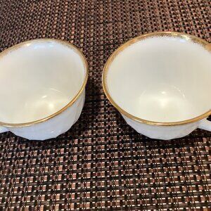 Fire King Swirl Milk Glass Cups White Gold Rim Teacups Vintage Oven Ware Set 2