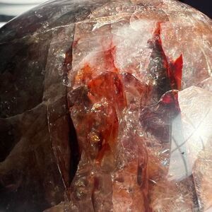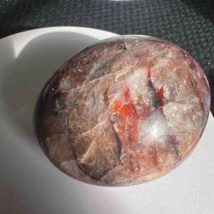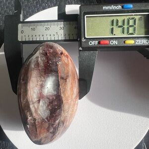 A large fire quartz palmstone, with its striking rainbow flash, captivates with its fiery inclusions and iridescent gleams. Metaphysically, it enhances focus, grounding, and spiritual growth, promoting energy balance, vitality, and emotional clarity, making it a powerful healing tool.