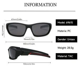 Crafted for the active man, these Polarized Sunglasses are the ideal companion for an array of outdoor sports and activities. The sleek black frame is complemented by a variety of lens colors—black, blue, and fire—allowing for a customizable look that suits any style. The lenses are designed with polarized, reflective, and mirror technologies, offering a clear view while reducing glare, making them perfect for driving, cycling, or fishing. The glasses provide 100% UV400 protection, ensuring your eyes are shielded from harmful rays during any outdoor adventure. The lightweight plastic frame, coupled with ergonomic temple lengths and a secure bridge width, provides comfort without compromising on durability. Whether you're hitting the road or the water, these sunglasses are designed to keep up with your lifestyle.