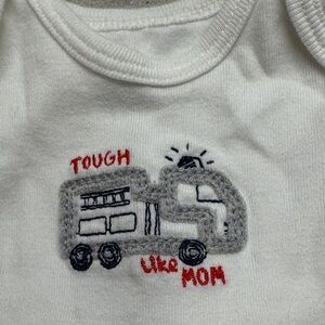 Adorable white baby onesie featuring a cute truck design with 'Tough Like Mom' text. Perfect for your little one to stay comfy and stylish.
