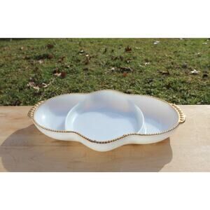 This is a great milk glass divided serving dish with three compartments and trimmed in delicate gold dots on curved edges. Very useful for all lovely trinkets you would like to beautifully display. Great as a catch-all or snack server. It would be a great wedding piece! It can also be hung for a unique piece of art.