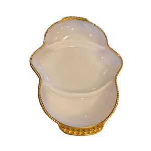 Beautiful Anchor Hocking Fire King ovenware dish in milk glass with gold trim. Good condition and no chips or cracks. Measures 11 in by 7.5. Beautiful piece with many purposes from dips and party trays to an elegant dish.