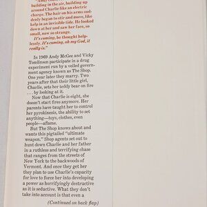 Synopsis: "Charlie McGee inherited pyrokinetic powers from her parents, who had been given a low-grade hallucinogen called "Lot Six" while at college. Now the government is trying to capture her and harness her powerful firestarting skills as a weapon."