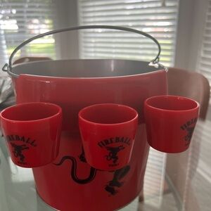 Fireball Whiskey metal ice galvanized bucket with 3 side shooter plastic shot glass holder new without box and women’s v neck T shirt. Size small excellent condition