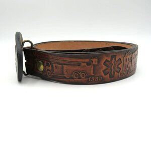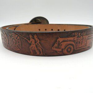 Firefighter Belt & Buckle Size XL Kat Kuszak Vintage Embossed Leather Fire Truck Rescue