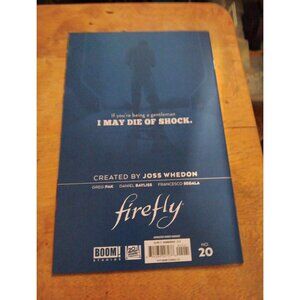 Introducing Firefly #20, a single issue comic book from BOOM! Studios. This modern age comic features the beloved characters from the Firefly animated series and is a must-have for any science fiction fan. The colorful style and boarded features make this comic a great addition to any collection.