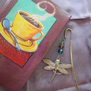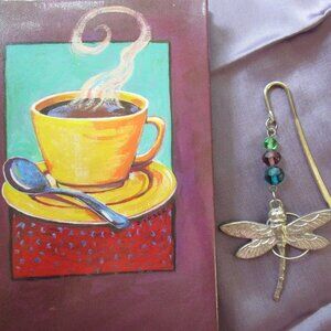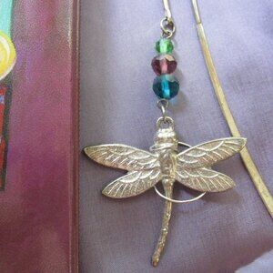 Three glass beads amethyst, green, teal. It has a silver wire with a turquoise stone at the end.