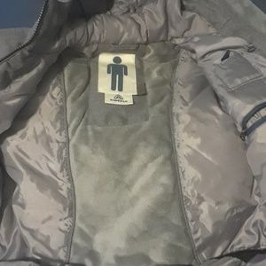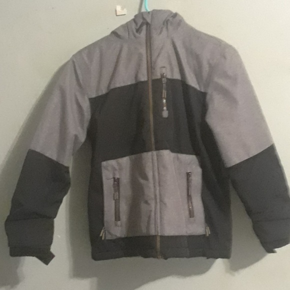 It's a big puffy jacket, with big pockets. It's a gray with black accents and many many pockets. It Evan has 2 pockets on the inside.
