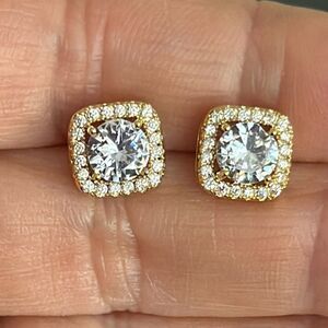Fireframe Square Halo Earrings – .4” Gold Plated Brilliant Cut CZ Studs for Men