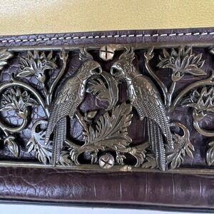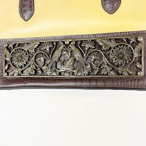 Firenze Bella Cream Yellow & Brown Pebbled Italian Leather Shoulder Bag. A truly unique piece with a floral & birds bronze metal decorative plate that graces the front. Purse feet. Interior pockets - one main compartment, three flap pockets, one zip pocket. Interior logo. Canvas lined interior. Zipper closure.