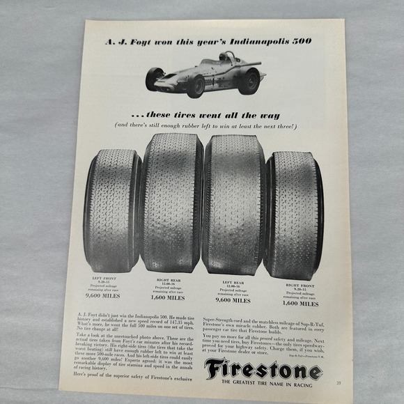 Firestone ad, A.J. Foyt, Indianapolis 500, Indy car racing, 1964 vintage ad, motorsports, racing memorabilia, garage decor, automotive art, winning car, retro racing, vintage magazine ad, 60s ephemera