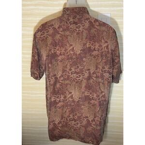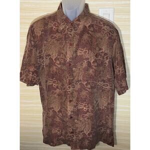 This is a Firethorn Men's Hawaiian Silk shirt in a muted red color, size M. It features a relaxed fit with short sleeves and a collared neckline. The shirt is a button-up style made of silk fabric, perfect for a casual yet stylish look. The woven fabric adds texture to the design, making it a comfortable and breathable option for warmer weather.