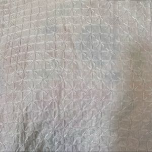 A tee-shirt with a quarter sleeve and a two-layer ruffle. The back has a pleat. The front is embroidered in white on white, and the design looks like a bunch of little fireworks to me! The back is longer than the front. The brand is Simply Vera Wang and the size is small. Bust: 19”, Length: 22”, 6.2oz #preppy #embroidered #layer #firework #neutral