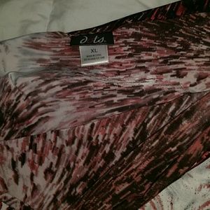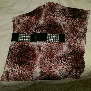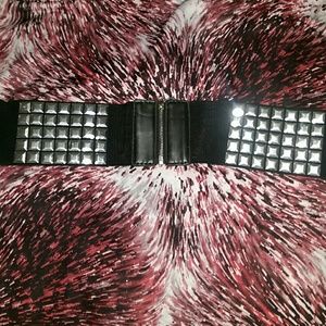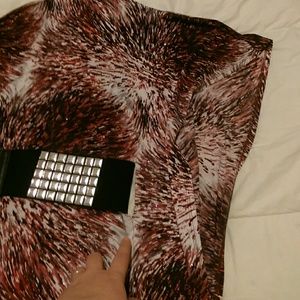 One shoulder, red and black with sparkles thru out. Very stretchy. Cute belt that zips in front. The one sleeve is flowey and where my finger is, is opening where the belt goes thru