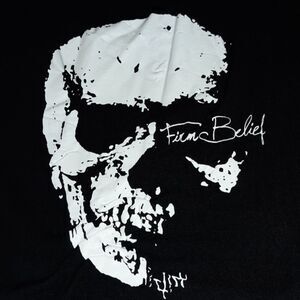 Super cool shirt, the sides are longer than the front & back, and the back is held together with soft, silky strings. It's got no tag, but I'm sure it's an XL at least. It is very stretchy and soft. It measures unstretched chest 40", length to front 21", length to longest part 30". The front has a skull graphic with the words Firm Belief. Picture #4 has a white tshirt behind the strings so you can see them. The white shirt is not included. Thanks for looking! #716