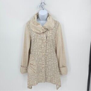 Firmiana Lagenlook Linen Blend Jacket Artsy Pockets Button Front Sharkbite Hem