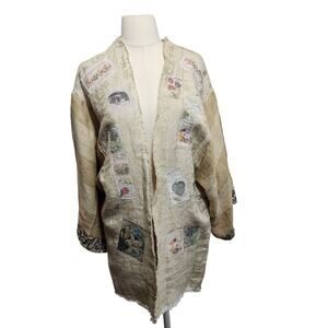 A true fusion of music and artistry! This unique band tee has been upcycled and reworked by me, transforming it into a stunning folk vintage shabby chic piece. Featuring faded fringes on the back with leather details, plus beautifully intricate appliqués of bucolic roses, butterflies, and leaves, it embodies both free-spirited charm and timeless rock nostalgia.
