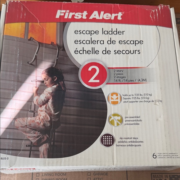 First Alert 2-story escape ladder. Supports up to 1125 lbs. Pre-assembled and easy to use.