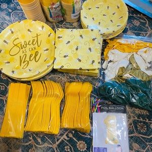 ‘It’s Sweet To Bee One’ Birthday Decorations & Supplies… I custom made the garland, metal sign, and bee hives. Plates/Napkins, table runners, and decorative bees are from Hobby Lobby if you need more. The customizable matching birthday invitation and milestone poster digital downloads can be purchased from Etsy. Paid close to $400 for everything, asking $200.